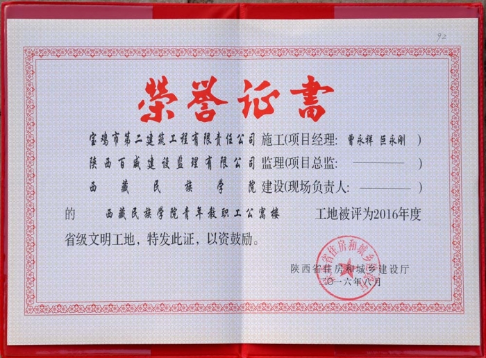 2016年省級(jí)文明工地(西藏民族學(xué)院證書(shū))
