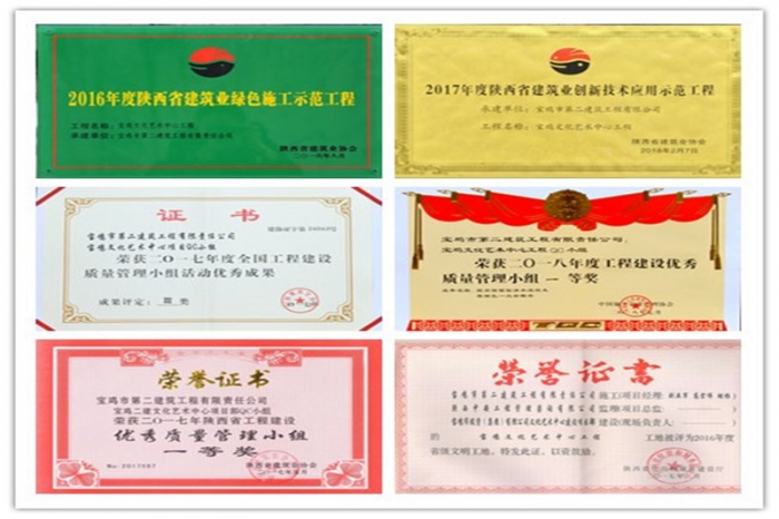 艱難困苦,玉汝于成。通過項目團(tuán)隊全體員工的共同努力,寶雞文化藝術(shù)中心項目先后被評為“2016年度寶雞市優(yōu)質(zhì)樣板主體工程”“2016年度陜西省建筑業(yè)綠色施工示范工程”“2016年度陜西省省級文明工地”“2017年度陜西省建筑業(yè)創(chuàng)新技術(shù)應(yīng)用示范工程”“2017年度陜西省建筑業(yè)優(yōu)質(zhì)結(jié)構(gòu)工程”;項目部先后榮獲全國工程建設(shè)質(zhì)量管理小組活動成果獎4項、陜西省工程建設(shè)優(yōu)秀QC小組成果獎7項,申報陜西省省級工法1項;項目部先后榮獲公司先進(jìn)黨支部、先進(jìn)單位、經(jīng)濟(jì)貢獻(xiàn)特別獎單位、“安康杯”安全文化知識競賽活動二等獎,規(guī)劃局系統(tǒng)先進(jìn)黨支部等榮譽(yù)。