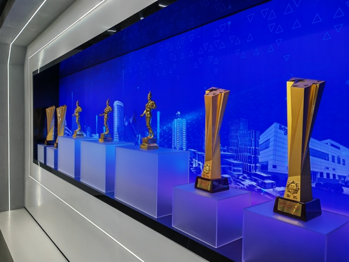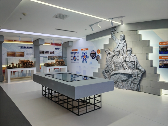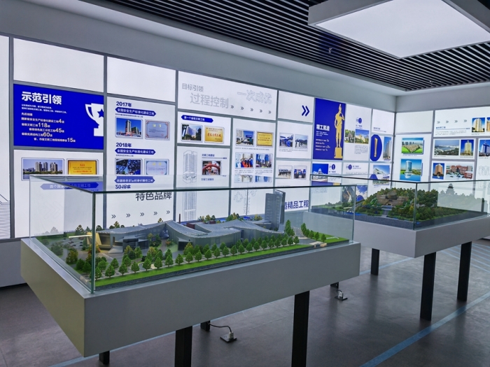 企業(yè)展覽館總面積516㎡,共分為四個展示單元,分別是:第一單元平地起高樓,主要展示集團(tuán)公司歷史沿革;第二單元風(fēng)雨筑輝煌,主要展示集團(tuán)公司壯闊征程;第三單元黨建強(qiáng)引領(lǐng),主要展示黨建、企業(yè)文化;第四單元公司榮譽(yù)展示;通過實物、展板、沙盤、模型、視屏、雕塑等表現(xiàn)手法,以圖、文、影、聲并茂的形式全方位呈現(xiàn)集團(tuán)公司走過的艱辛之路、創(chuàng)新之路、豪邁之路。